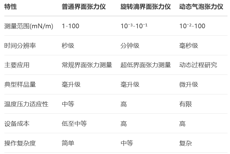 在实际科研和工业应用中,如何选择合适的界面张力仪取决于具体的测量需求和研究目标。下表总结了三种主要类型界面张力仪的关键特性比较:
